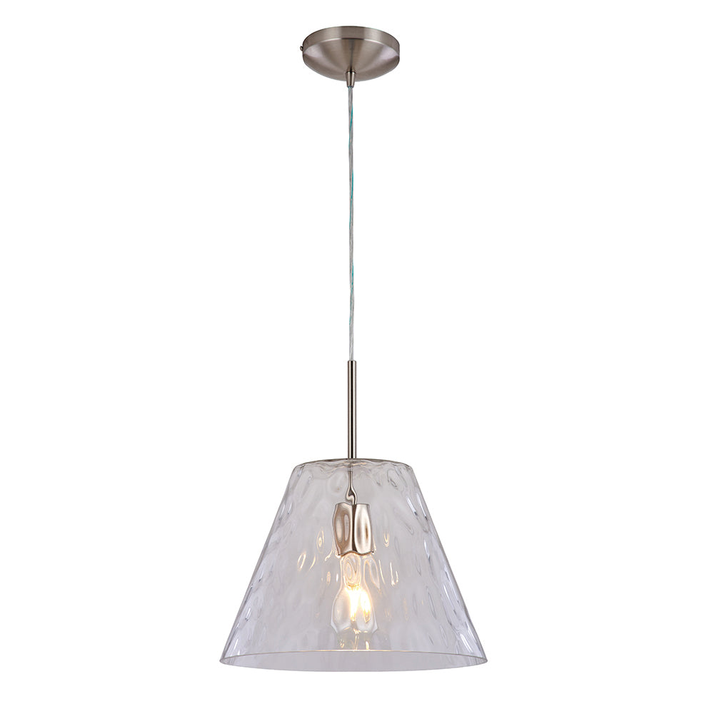 Our Emmeline Pendant blends modern elegance with subtle texture for a beautifully refined look. Its clear, dimpled glass shade gently flares outward, diffusing light with a soft, sparkling effect. Finished with a sleek brushed metal or black ceiling rose and adjustable suspension cable, the Emmeline adds understated sophistication to any interior. Perfect for kitchens, dining areas, or hallways, it offers a timeless balance of simplicity, style, and warmth.
